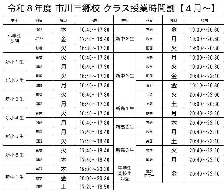 | 定員情報 | 現在はすべての学年で生徒を募集しております。 「個別アワー」を設置しました。 常駐するプロ講師に質問しながら学習をすすめられる、利用しやすいコースです。 2週間の無料体験ができますので、ぜひ校舎までお問い合わせください |