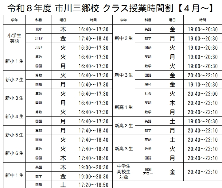 | 定員情報 | 現在はすべての学年で生徒を募集しております。 「個別アワー」を設置しました。 常駐するプロ講師に質問しながら学習をすすめられる、利用しやすいコースです。 2週間の無料体験ができますので、ぜひ校舎までお問い合わせください |